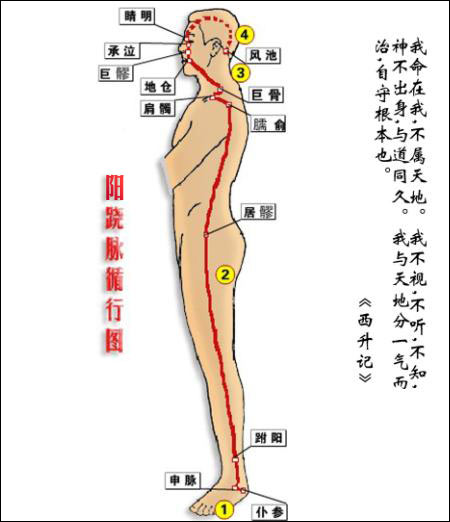 起于足跟外侧,经外踝上行腓骨后缘,沿股部外侧和胁后上肩,过颈部上挟口角,进入目内眦,与阴跷脉会合,再沿足太阳经上额,与足少阳经合于风池。